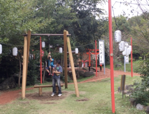 お子さんが遊べるアスレチックやツリーハウスもあり、その側には小川が流れていて、夏は水遊びができます。