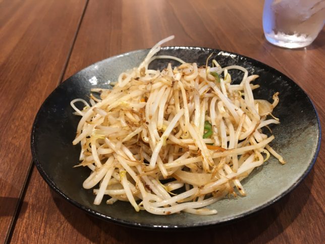 そしてステーキに付いてくるもやし炒め。こちらはポン酢をつけて食べるとオススメとマスターのお言葉。