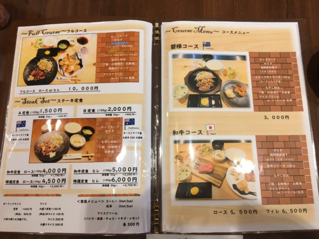夜のメニューはこんな感じ。和牛に海鮮鉄板焼きが付いたフルコースだと5桁行っちゃうんですね〜。