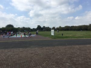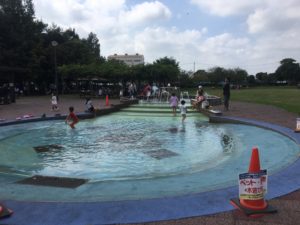 入ってすぐの噴水広場では、気温が高かったこともあって、水遊びに興じるこどもの姿も。