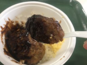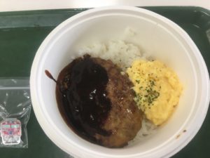 ご飯にデミグラスハンバーグやスクランブルエッグが乗ったものとなります。