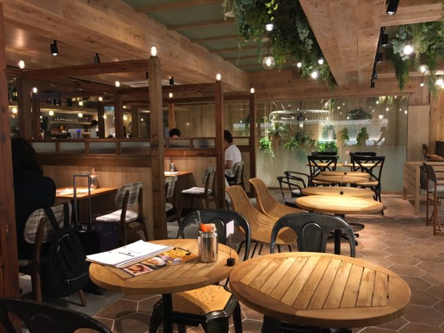 テーブル席が主体の店内にも、木や植物を用いた装飾が多く施される。席数も100あり、エキュート大宮内の店舗としては最大だ。