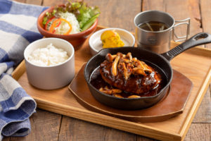 ランチ時間帯は国産牛山小屋風デミグラスハンバーグセットや肉厚アジフライのセットなど全10種を¥1,000より提供する。誰にとっても馴染みがありわかりやすいメニューを多く採用するが、アウトドア色を演出するため全ての定食に豚汁をつけるなどこだわりも見られる。