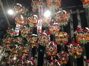 鳥居をくぐり神社の境内に足を踏み入れると、すぐ左手には豪華絢爛な熊手が並びます。