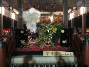 境内の能舞台には草月流の生け花がなされており、思わず足を止める参拝客の姿もありました。