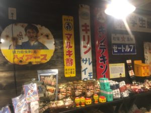 ポン菓子のにんじんだったりコーラのラムネだったり、誰もが幼き日に一度は食べたであろう駄菓子がたくさん販売されており、ホーロー看板などの装飾も合わさって本当に幼少期の駄菓子屋にタイムスリップしたような気分になれますよ。