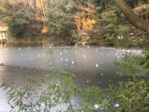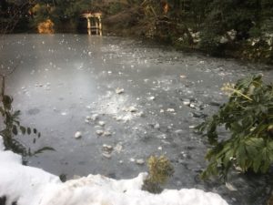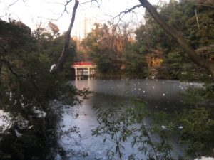 連日の寒さで、神社の池も見事に凍っていますよ。