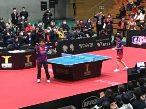 第1マッチはダブルスでスタート。琉球は吉村選手とリ・ピン選手、T.Tはウォン・チュンティン選手と神選手のペアで挑んだ。