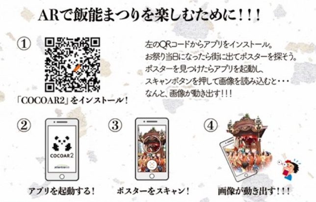 開催期間中に後援になっている地域新聞・文化新聞の紙面や街中のポスターをCOCOAR2アプリで撮影すると、まつりの写真が動き出すという。