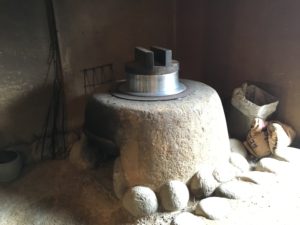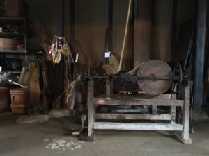 ムシロ編みの作業場や台所として使われていたこの土間。古い農機具やカマドもそのまま置かれています。