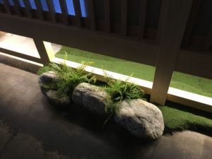 通路部には石や草木が置かれ、ムードを演出。駅近のビルの2階ではあるものの、和の雰囲気がたまらない作りになっています。