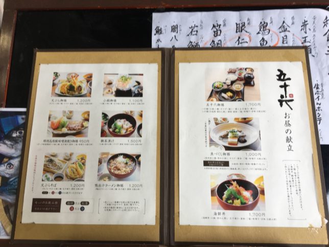 2膳から成る五十六御膳をはじめ、鯛茶漬けや海鮮丼など¥1000〜¥2000代のお手頃価格で提供しています。