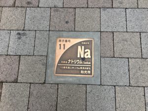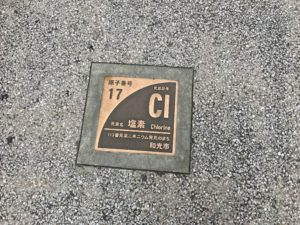 さらに原子番号11のナトリウムに17の塩素と、元素が書かれたプレートが周期表の番号順に道に埋まっているんです。