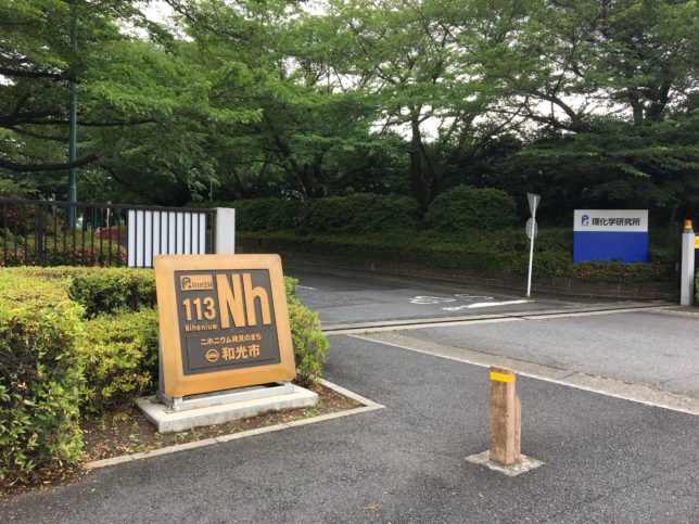 というわけで同研究所の正門までやってきたのですが、元素プレートはニホニウムより先も続いています。