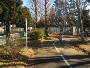 その名の通り、交通を題材にした公園で、公園内には実際の道路を模した道に道路標識がたくさん建っていて、さながら公園の中に公道が走っているようです。