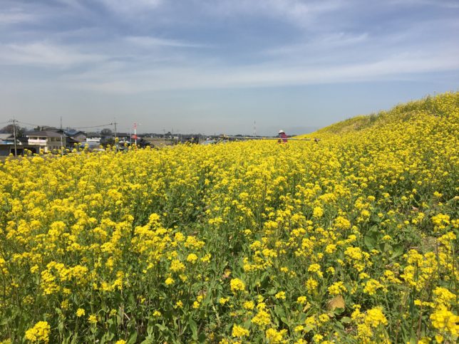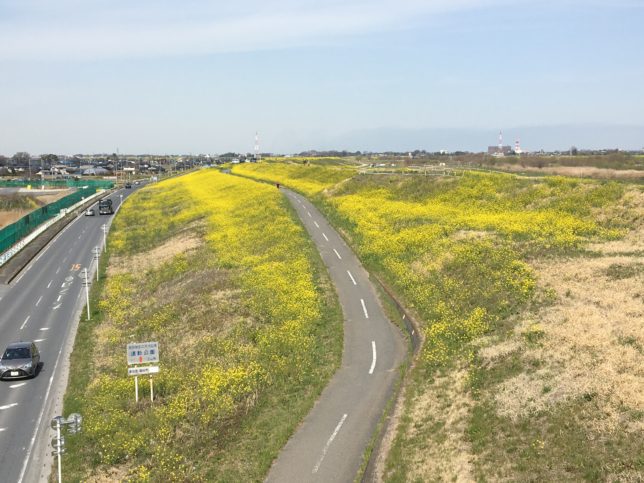 土手側に出てみると、咲いているのは菜の花。黄色い花を咲かせており、まさに春を象徴する場面と言えるだろう。
