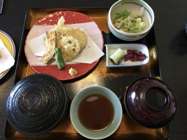 なまずや野菜の天ぷらを中心に、ご飯と味噌汁、漬物や香物がつく。