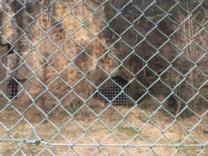 もう少し行ってみると錆びた門にフェンスのついた穴まであるぞ。